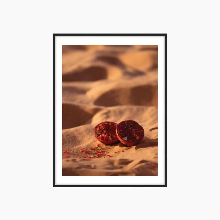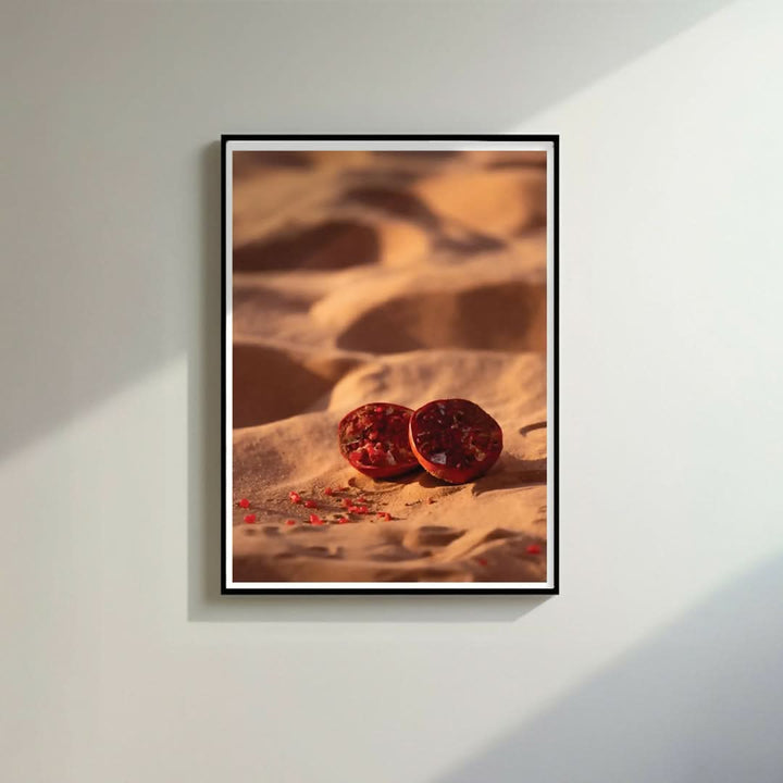 نقدم لكم لوحة "رشات من حلاوة" للفنانة فاطمة بغدادي، وهي مطبوعة فوتوغرافية خلابة تمزج ببراعة بين العملية والأناقة. يلتقط هذا العمل الفني لحظة من الجمال الرقيق في قلب الصحراء. لوحة شاعرية تجمع بين التباين والثقافة، تجسّد جوهر الطبيعة ورواية القصص من خلال الطبيعة الصامتة. تُضفي الإضاءة الدافئة أجواءً هادئة، بينما تتناثر بذور الرمان الحمراء كالجواهر الثمينة على الرمال، داعيةً المشاهدين إلى تقدير جمال اللحظة.