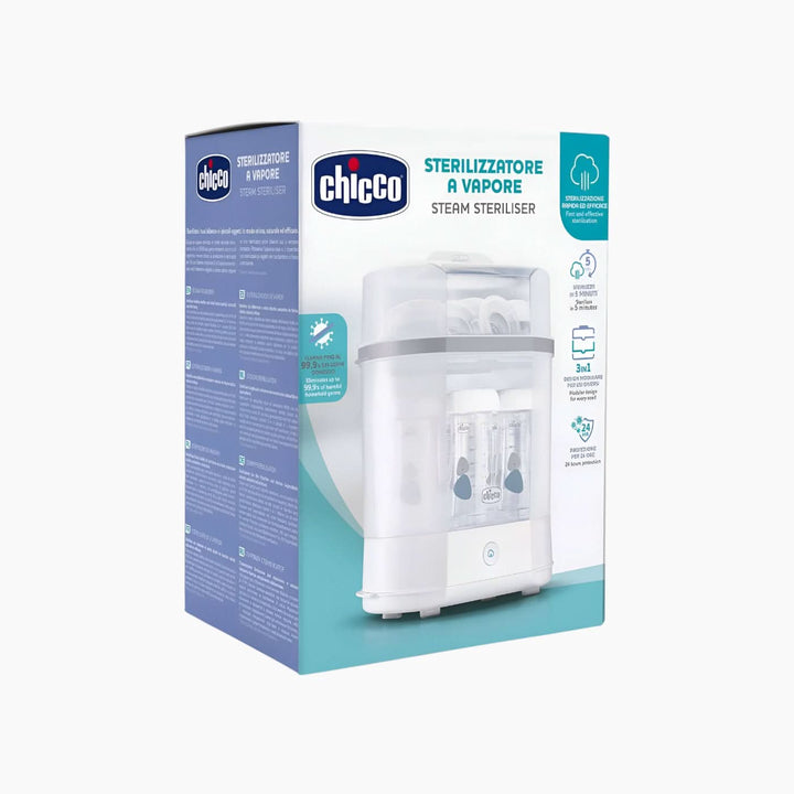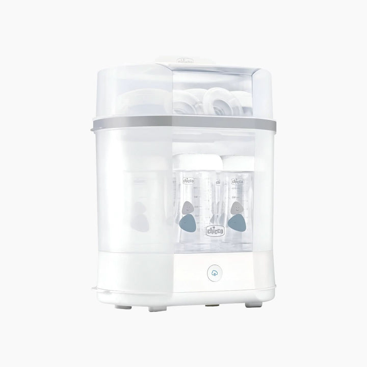 نقدم لكم معقم تشيكو البخاري 3 في 1، منتج رائع يجمع بين العملية والأناقة. هذا المعقم المبتكر يجعل عملية تعقيم زجاجات الأطفال واللهايات سهلة للغاية، حيث يقضي على 99.9% من الجراثيم والبكتيريا في دقائق معدودة - دون استخدام مواد كيميائية أو روائح أو مذاق لاحق.
