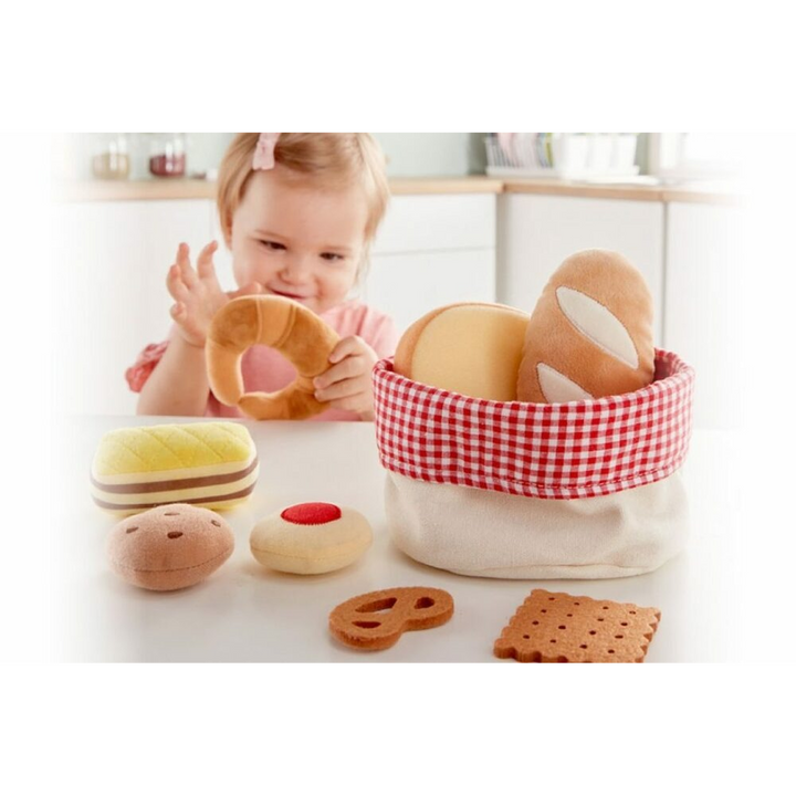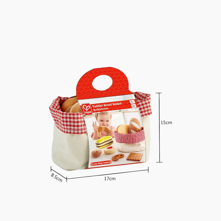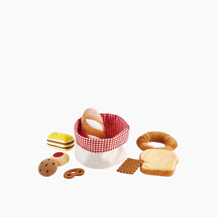- Contents: Includes a soft fabric basket and assorted wooden bread pieces.