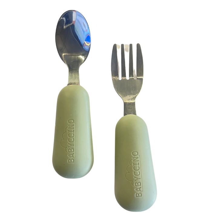 مجموعة ملاعق وشوكة للأطفال الصغار مصممة خصيصًا لأيديهم الصغيرة الجاهزة لتغذية أنفسهم - مع قبضة سيليكون أكثر صلابة لمزيد من السيطرة والثقة أثناء وقت الطعام. مثالية للأعمار 1+ 🍴