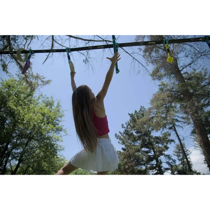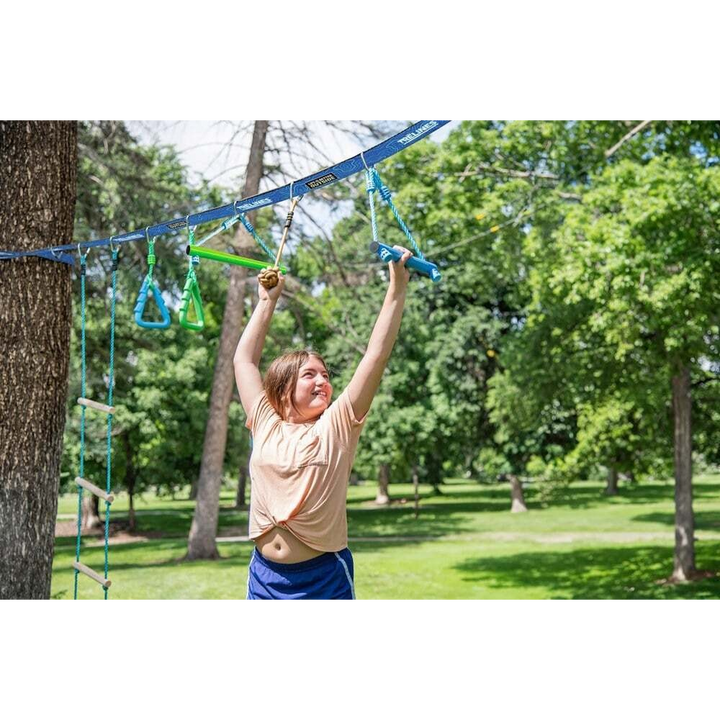 - Components include a slackline, ninja grips, circular rings, a rope ladder, and adjustable hanging accessories