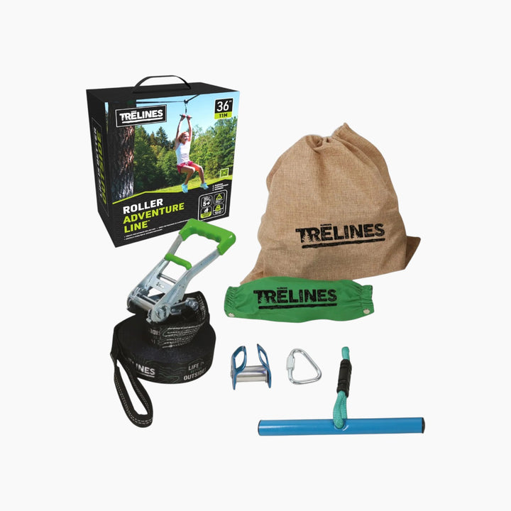 A dynamic gliding and balance course designed for kids. Measuring 36 feet in length, this engaging activity promotes excitement and skill development for children aged 5 and up. The setup is easily adjustable between trees, providing a safe and realistic gliding experience for solo adventurers.