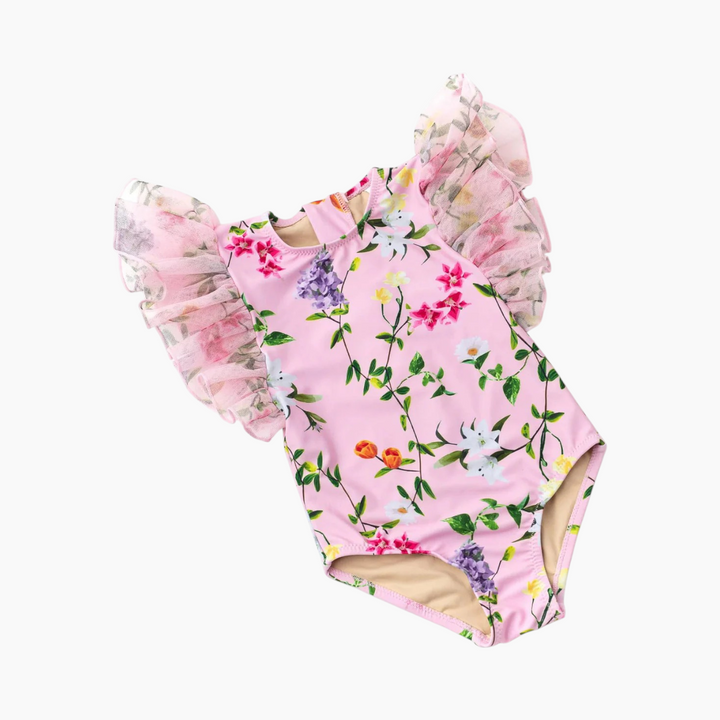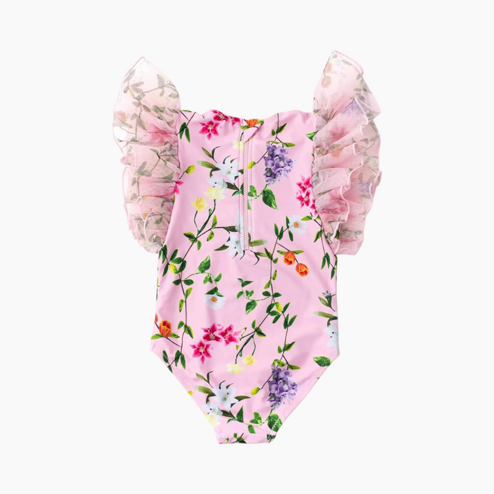 Unveiling a delightful choice for young fashionistas: the one-piece swimsuit with charming tulle sleeves and a captivating wildflower vine pattern. Perfect for creating picture-perfect moments at the beach or by the pool, this swimsuit ensures both style and comfort. Made from ultra-soft fabric, it guarantees a gentle touch on delicate skin, allowing your little one to play and splash around with ease.