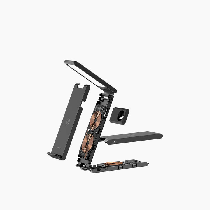 Streamline your desk and illuminate your workspace with the USAMS CD181 3-in-1 Folding Wireless Charging Stand With Table Lamp. This innovative device effortlessly powers your smartphone and earphones while doubling as a convenient task light, all within a compact, foldable design.