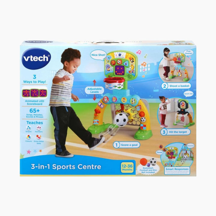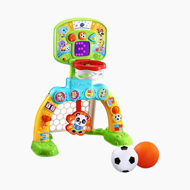 Discover the ultimate interactive experience for young athletes with this versatile 3-in-1 sports playset, designed for toddlers aged 12 months and up. This engaging toy offers hours of fun and learning through basketball, soccer, and target shooting activities. As your child scores goals or makes baskets, motion sensors activate exciting sounds, while the animated LED scoreboard keeps track of scores and displays captivating visuals. With over 65 songs, melodies, sounds, and phrases, this playset also helps teach shapes, colors, numbers, and sportsmanship.