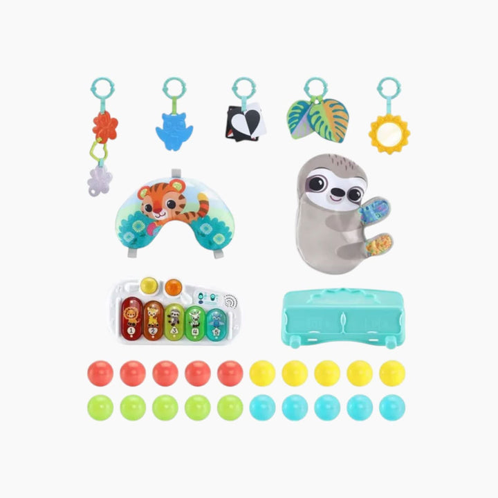 - ملحقات تفاعلية: تتضمن مرآة الشمس، ورق الأوراق المقرمشة، والبومة الناعمة، وبطاقات التعلم، وألعاب قابلة للتعليق، ووسادة وقت البطن.