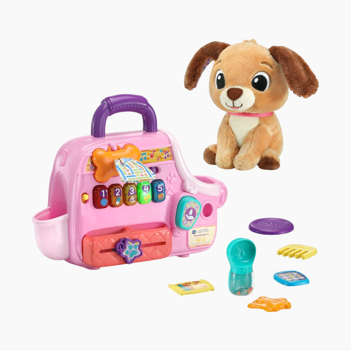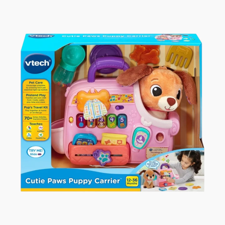 Discover an enchanting playtime experience with this charming puppy carrier set designed for children aged 12–36 months. The delightful pink puppy-themed carrier houses a soft plush puppy companion along with a range of play accessories including a brush, food bowl, and bone. Its interactive front panel features light-up buttons that engage young minds through cheerful tunes and educational phrases, promoting imaginative play and language development.
