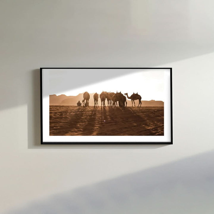 الأبعاد: 100×70 سم لون الإطار: أسود التصميم: يسلط الضوء على الثقافة البدوية الميزة: تقع في مواجهة سماء صحراوية واسعة تلتقط هذه الصورة جوهر الحياة البدوية الخالدة...
