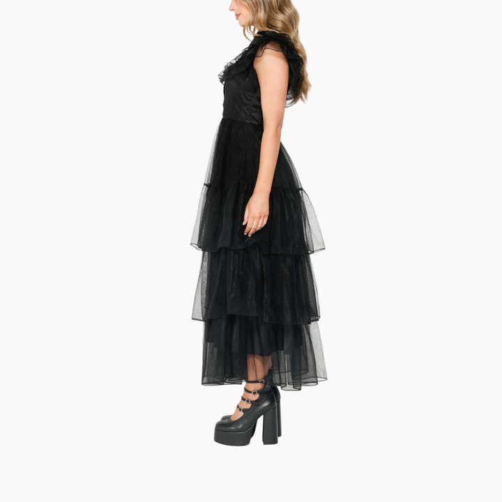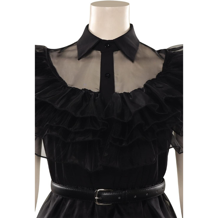 - تصميم أصيل: فستان أسود كلاسيكي مع ياقة بيضاء مميزة، يعكس النظرة الأيقونية من هذا النوع.