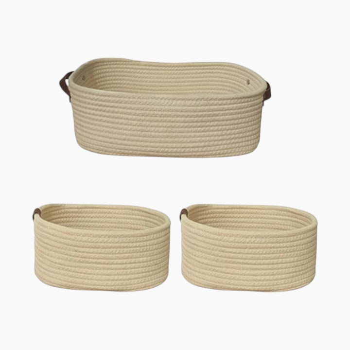 Weva Story Cotton Storage Basket With Leather Handle Set 100% Cotton 3 Pcs Ivory