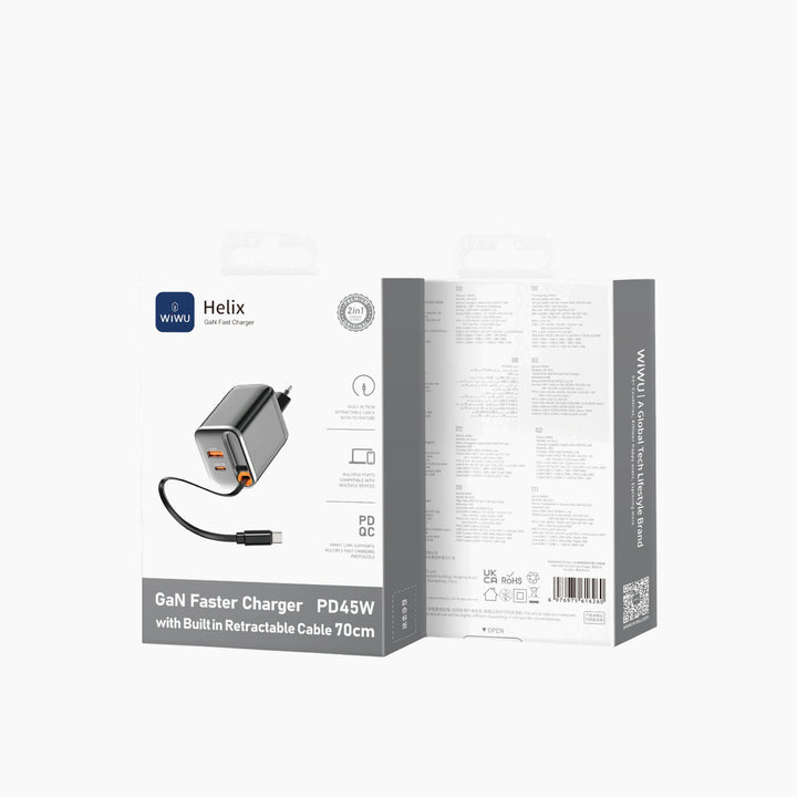 Introducing the WiWU Wi-G021 Helix GaN USB-C Fast Charger Adapter, your ultimate solution for rapid and efficient device charging on the go. This powerful 45W GaN charger streamlines your charging needs with its innovative design and versatile connectivity.