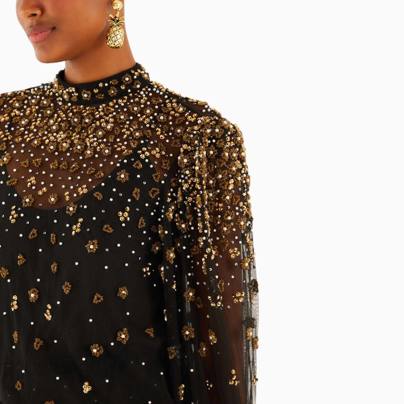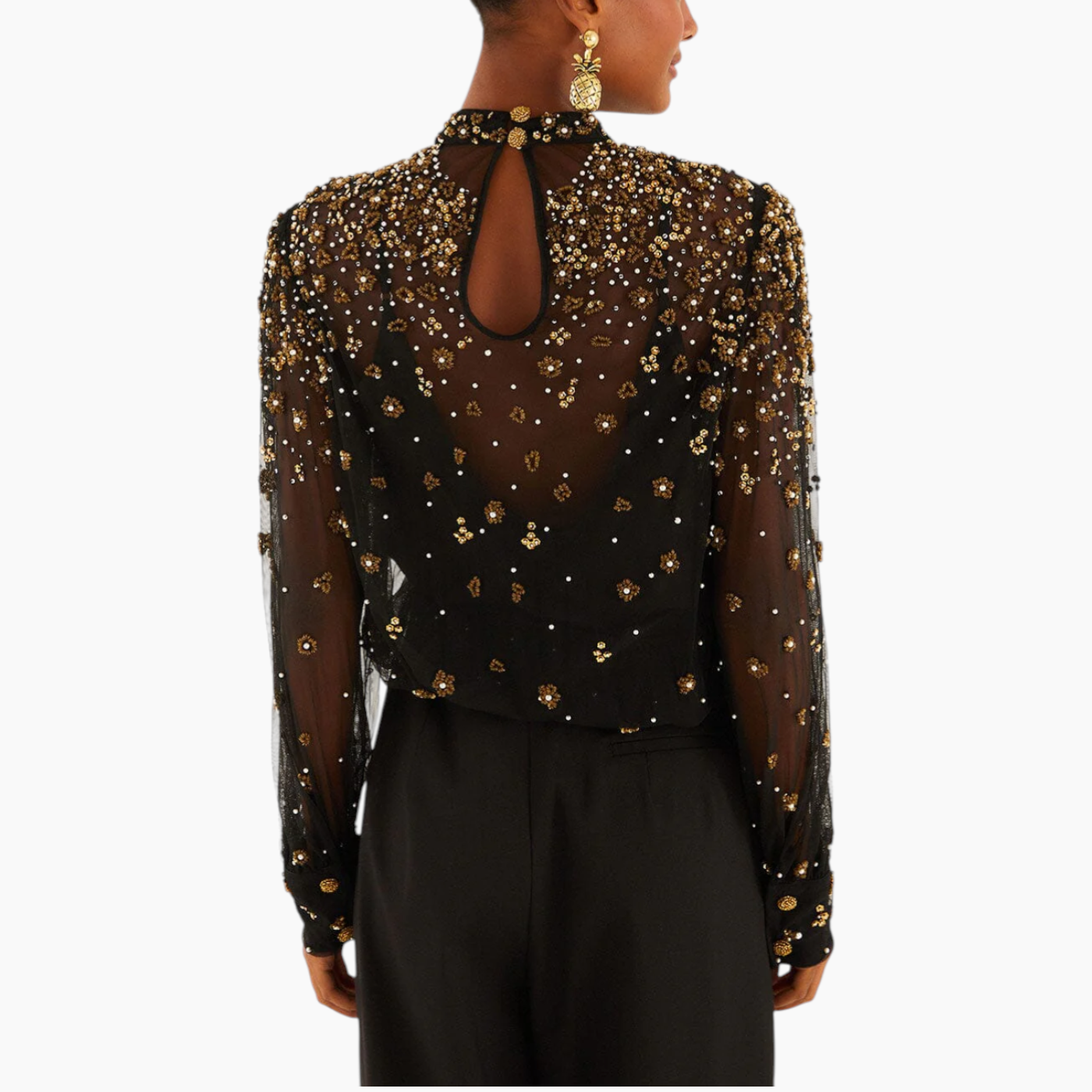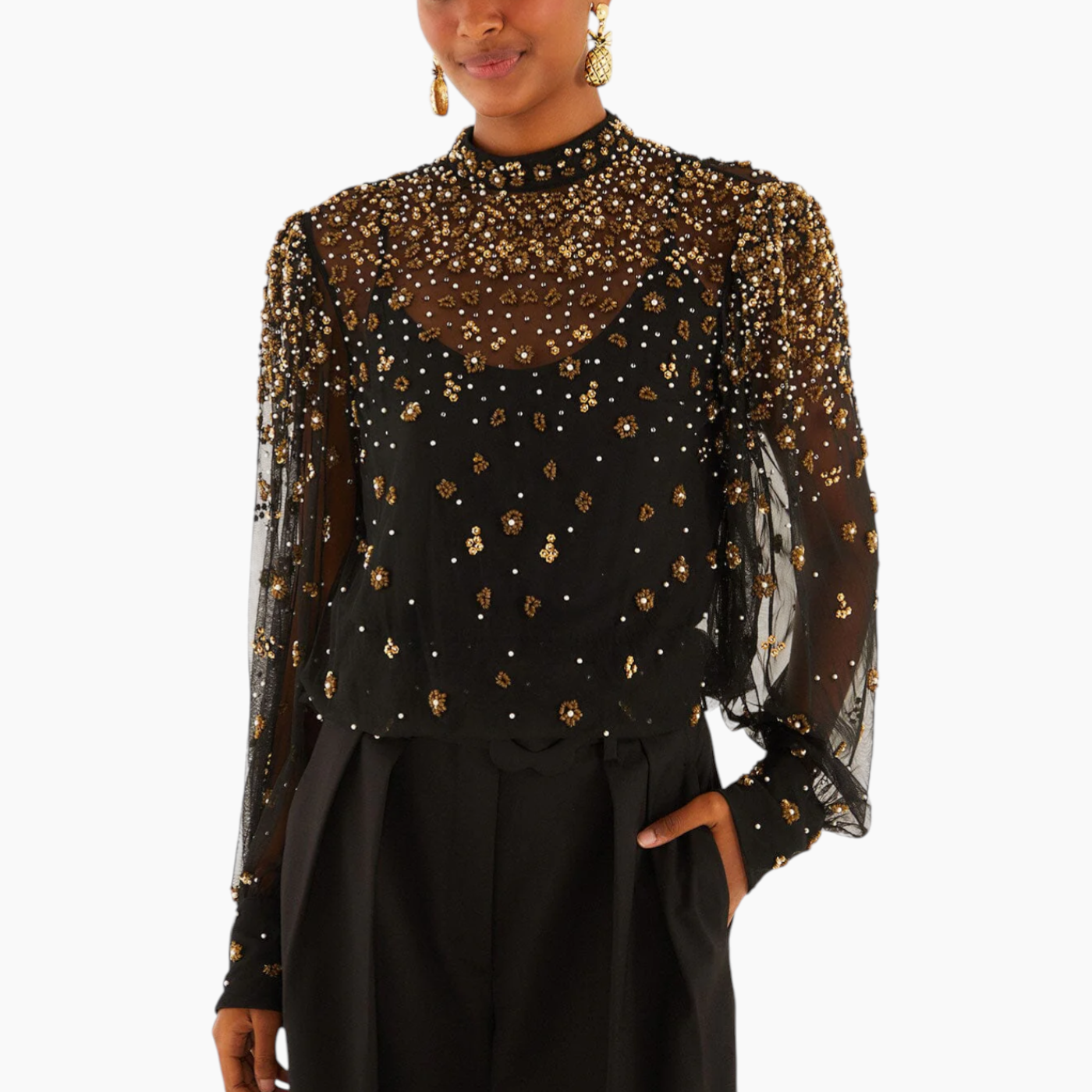 Farm Rio Black Embroidered Bubble Tulle Blouse( Small ) - https://shophuna.com/products/farm-rio-black-embroidered-bubble-tulle-blouse-1007?variant=53954502066460