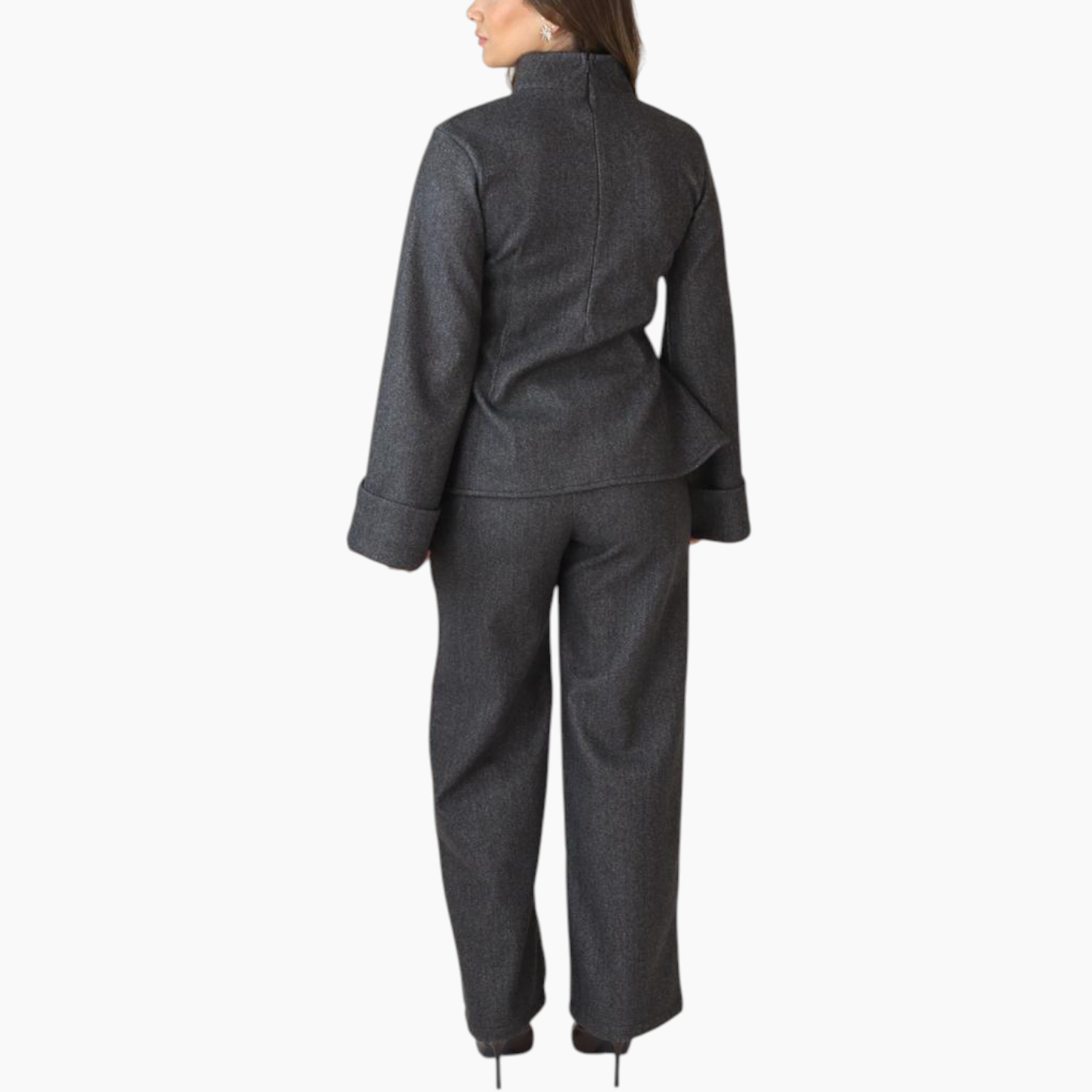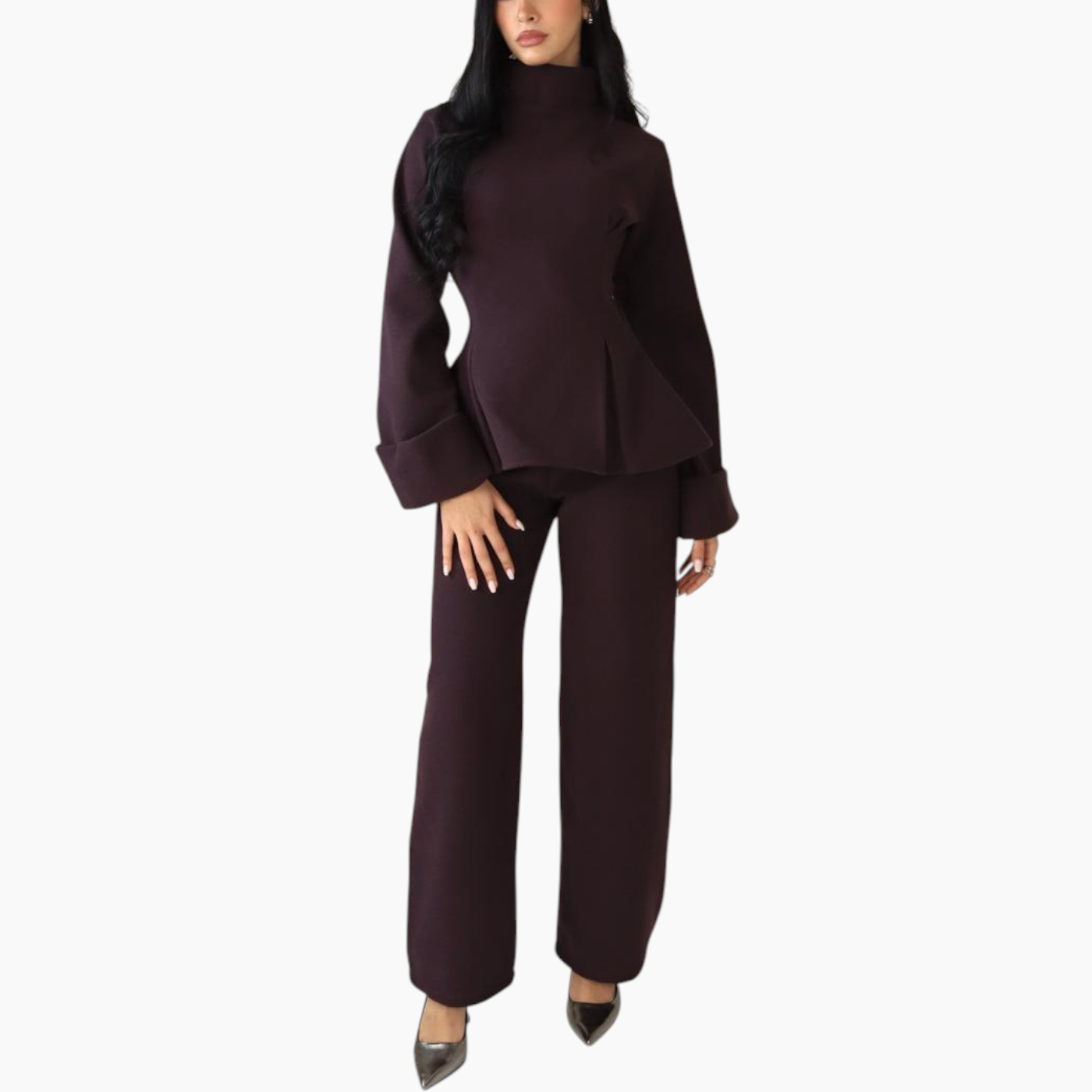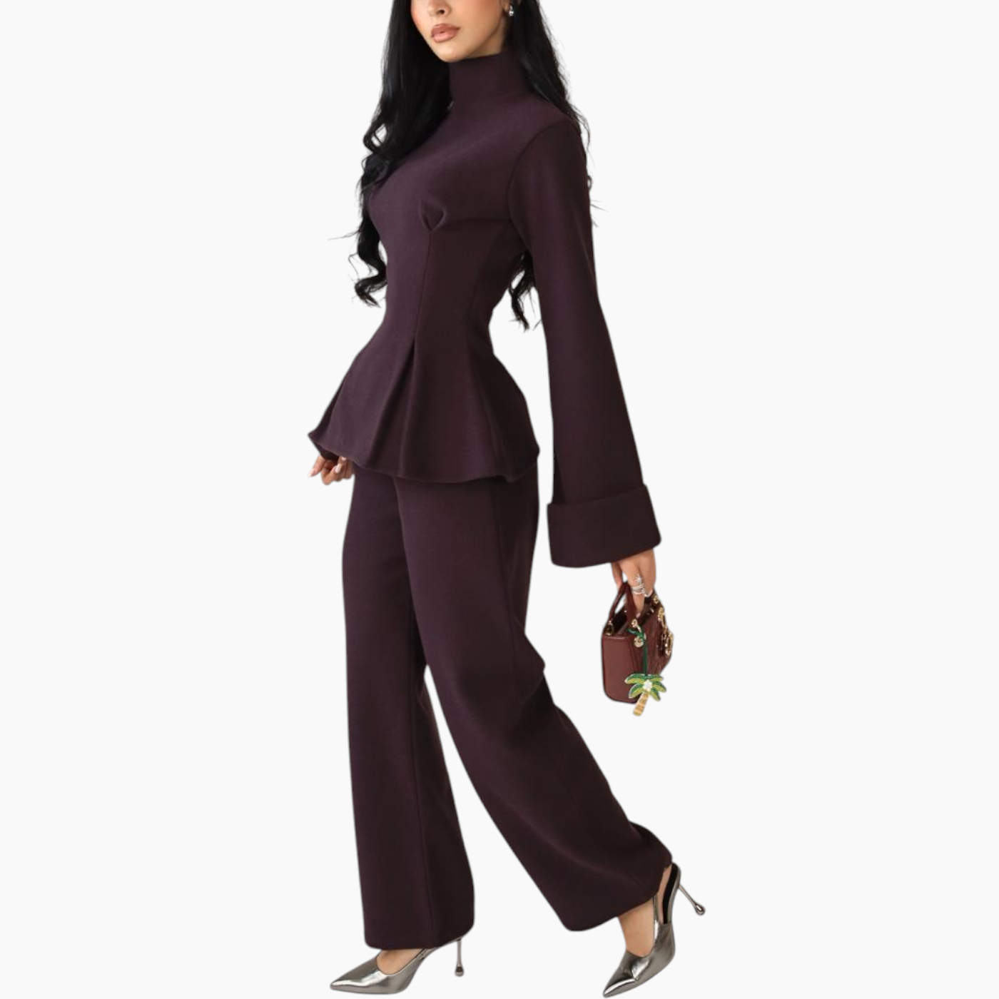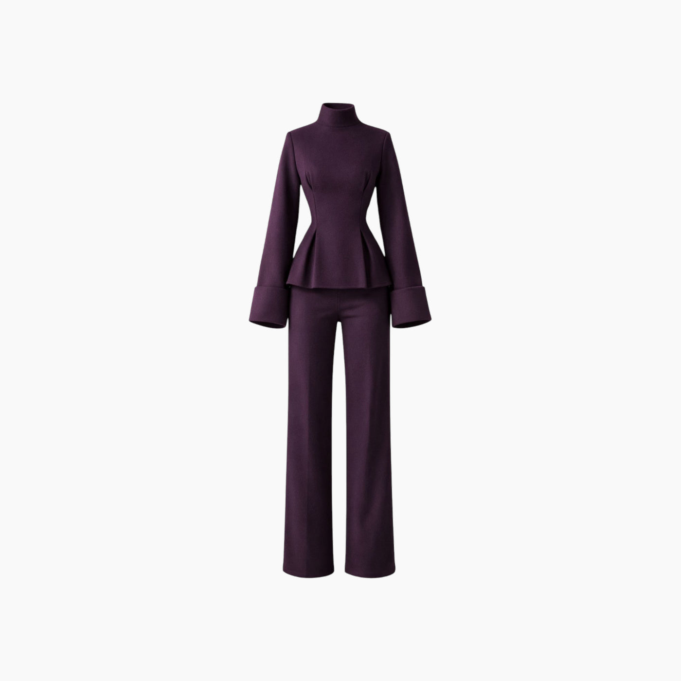 The Élan Set is crafted in an aubergine melton wool blend, marrying architectural structure with cozy winter warmth. The coordinated top and wide-leg trousers sculpt and...