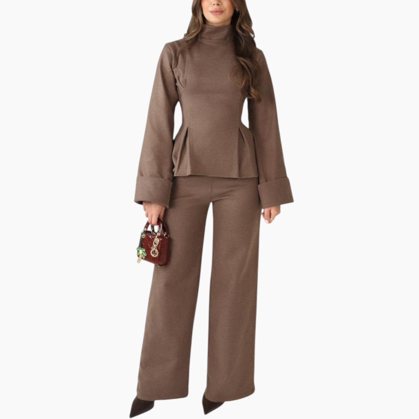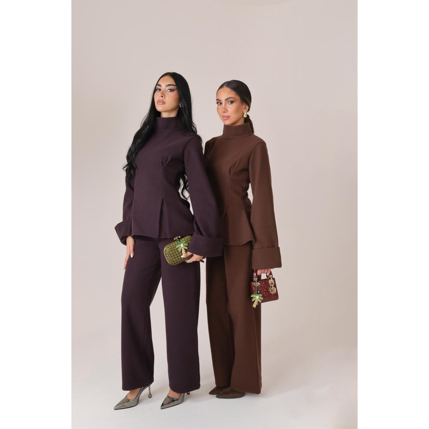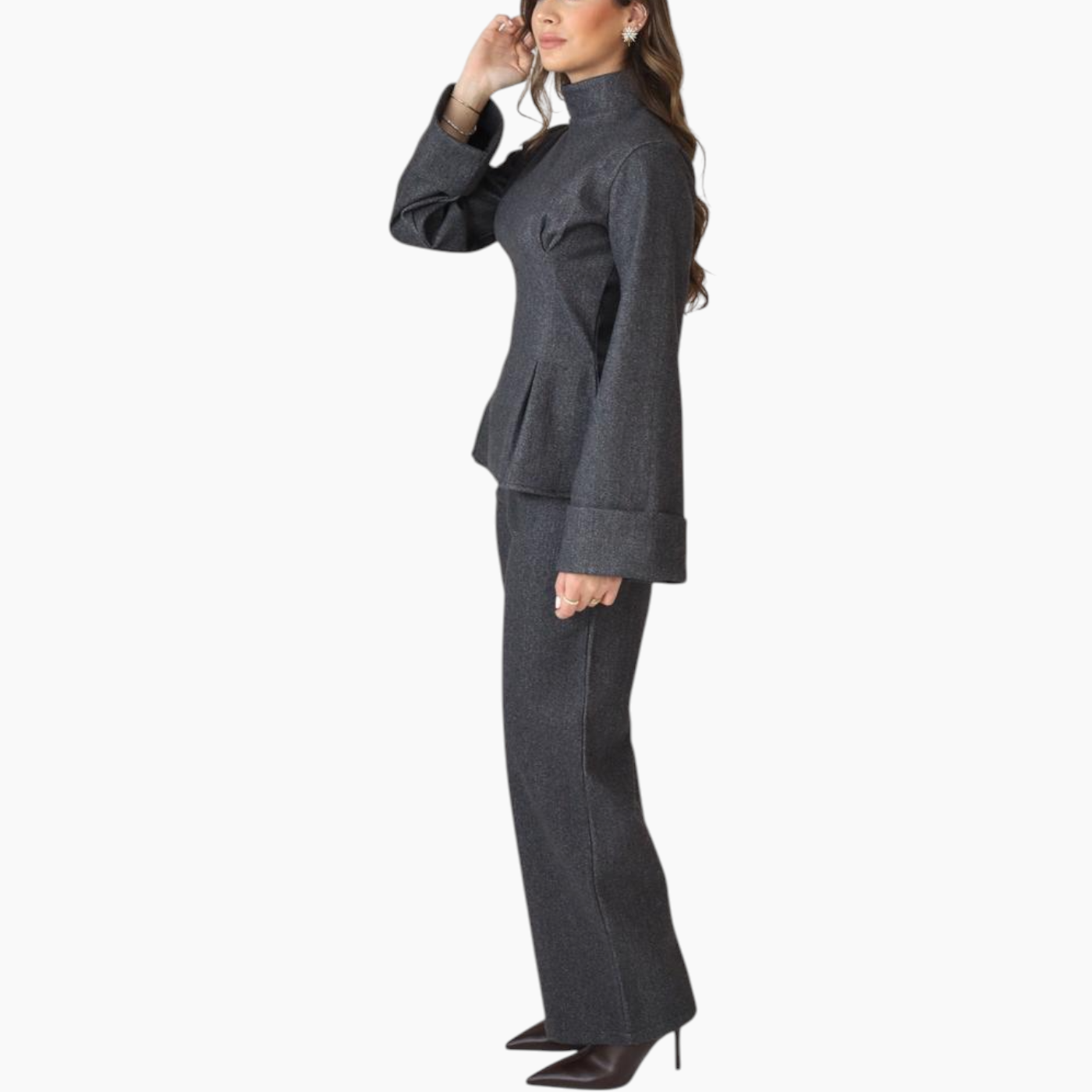 The Élan Set is crafted in an aubergine melton wool blend, marrying architectural structure with cozy winter warmth. The coordinated top and wide-leg trousers sculpt and...