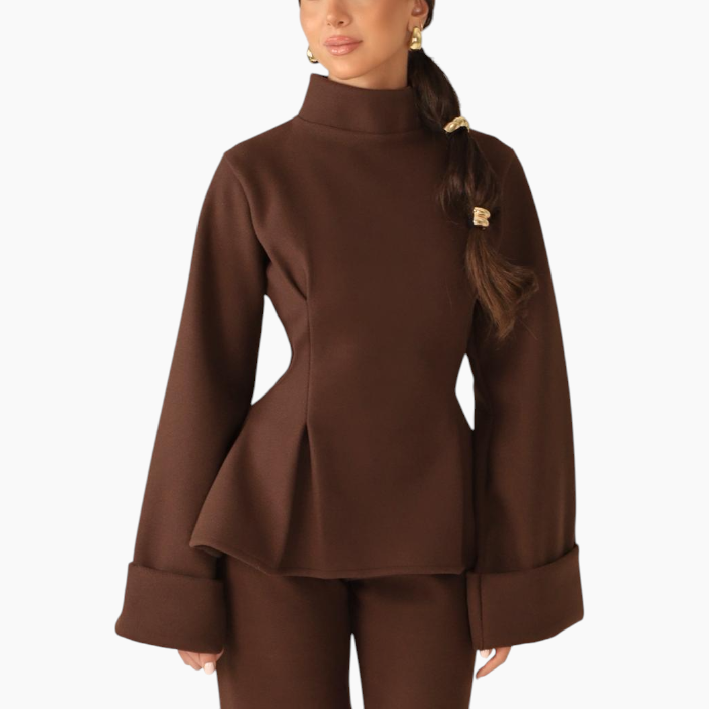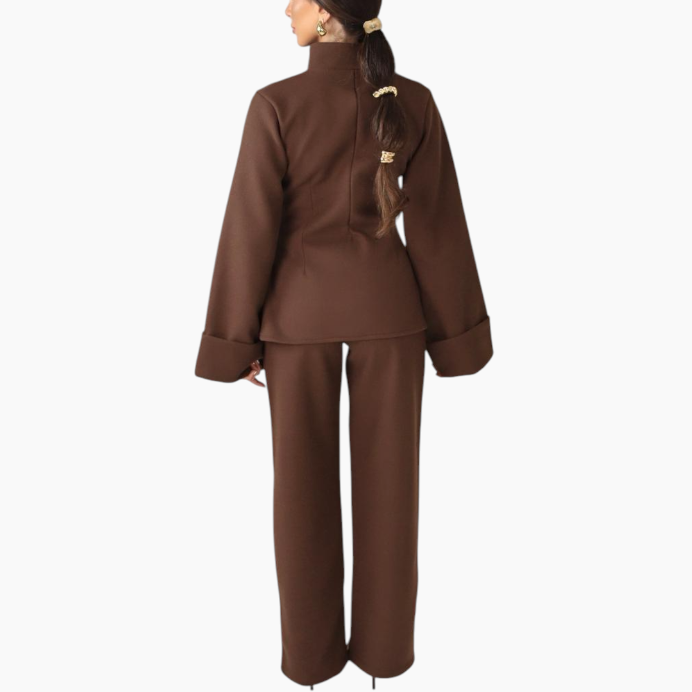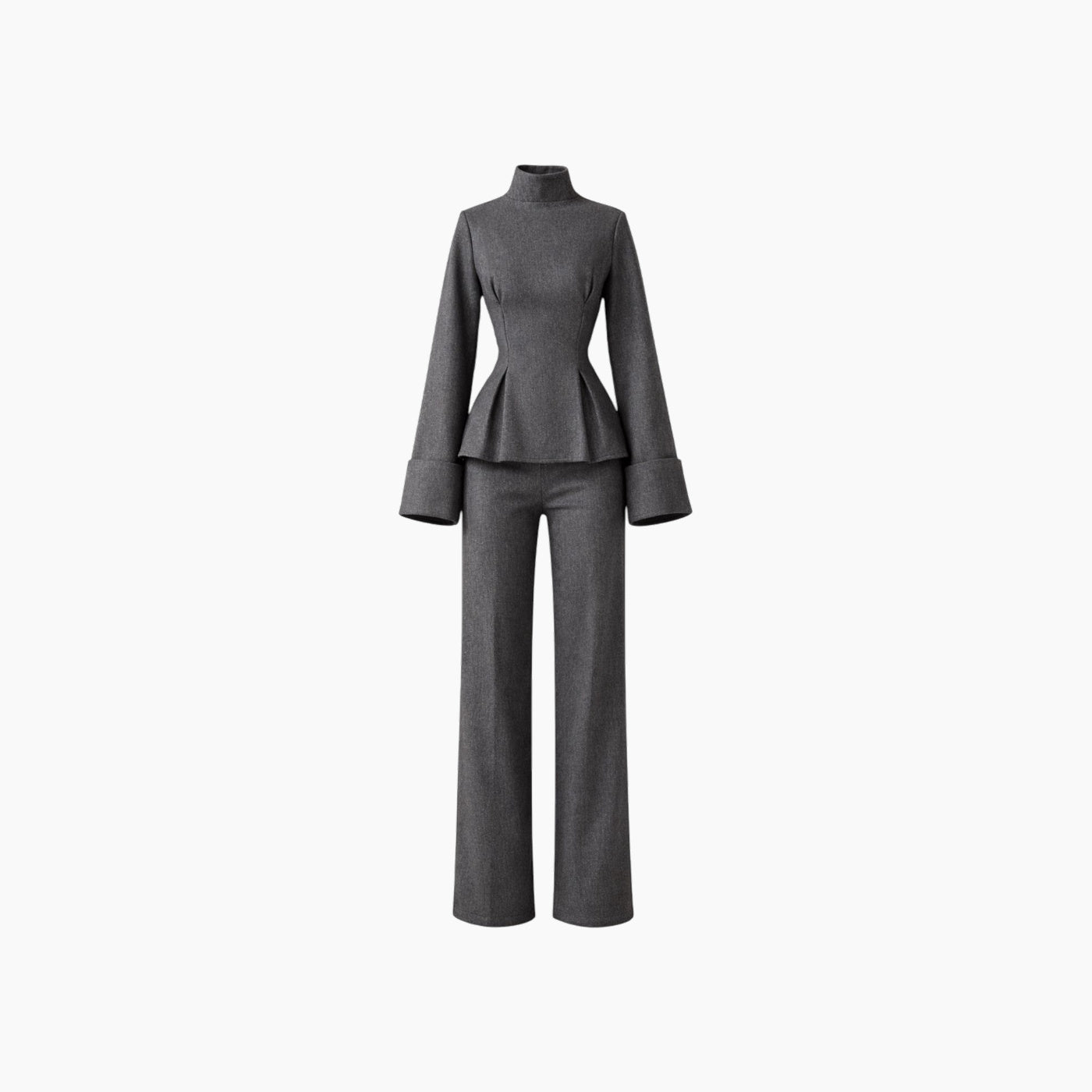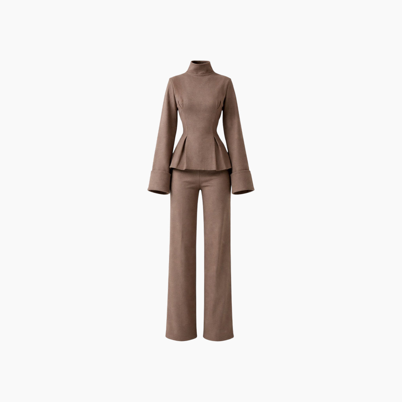 The Élan Set is crafted in an aubergine melton wool blend, marrying architectural structure with cozy winter warmth. The coordinated top and wide-leg trousers sculpt and...