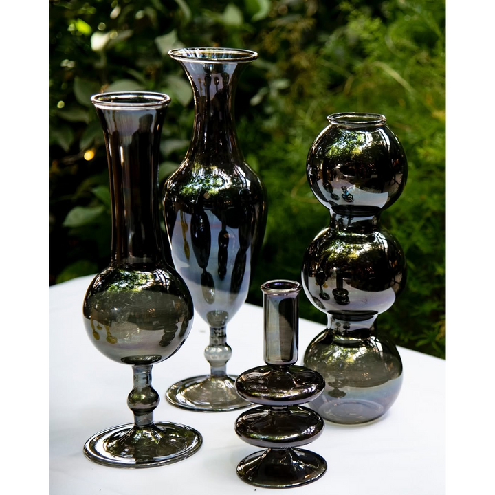 - Sophisticated set of three vases and one candle stand with a glossy black finish.