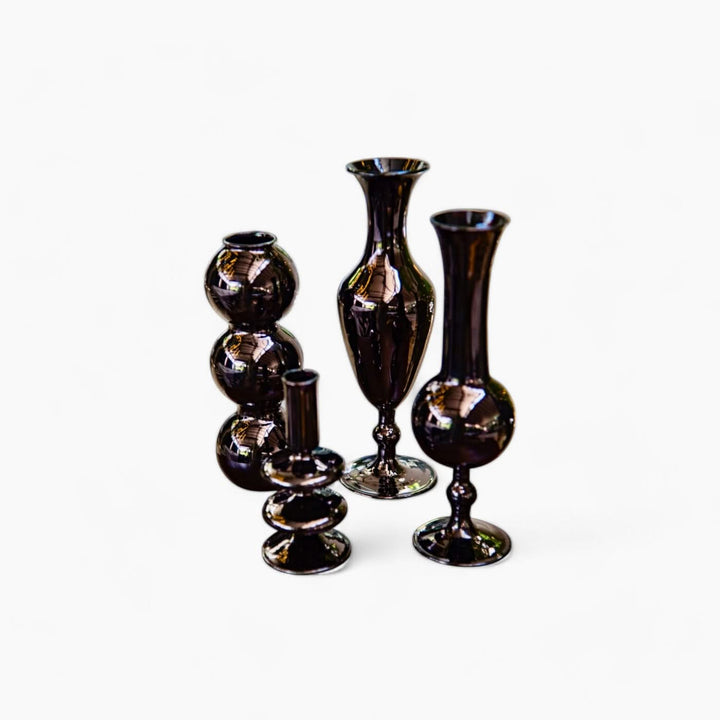 Introducing our sophisticated set of three vases and one candle stand, featuring a stunning glossy black finish that beautifully blends functionality with style.