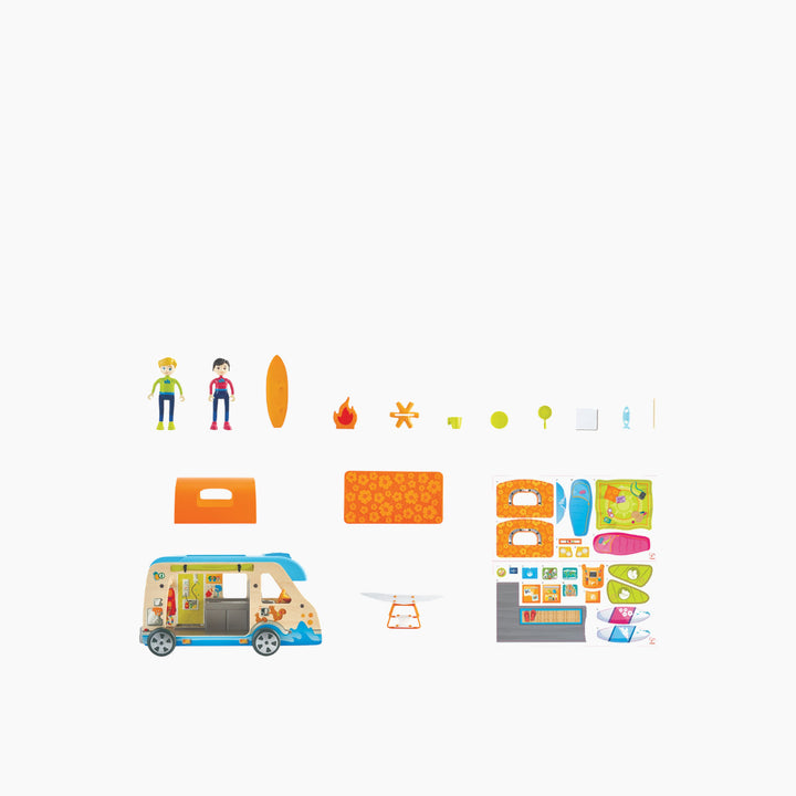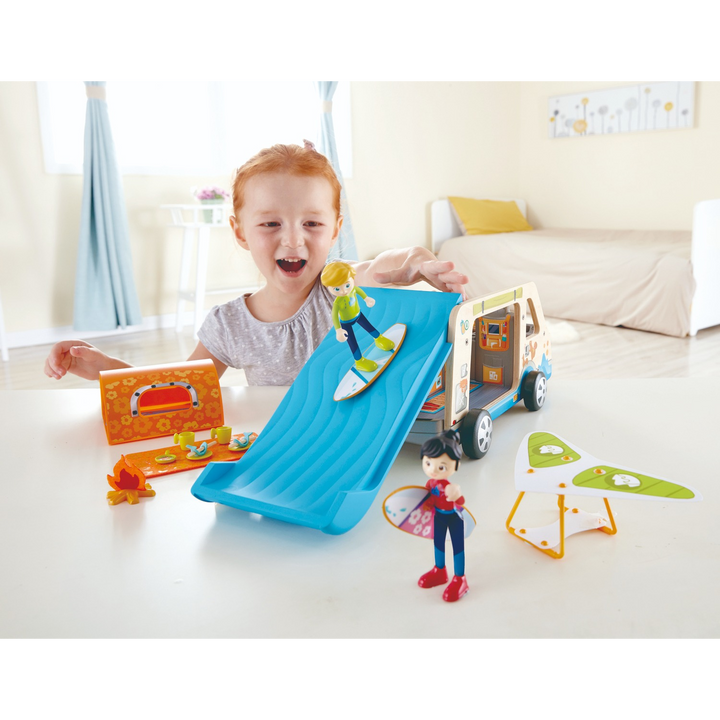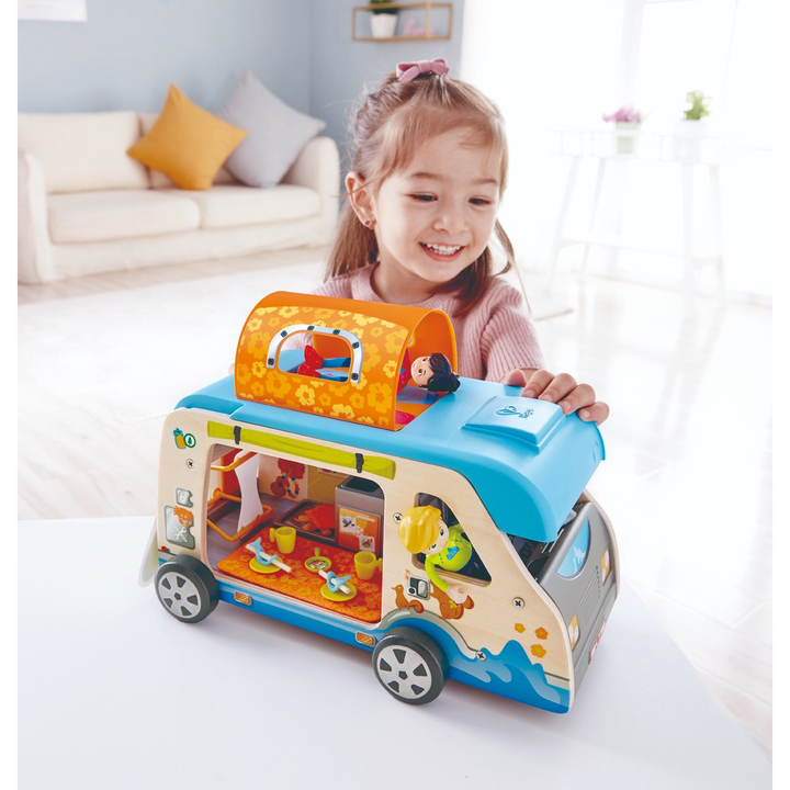 Unleash your child's imagination with this Adventure Van playset, a wooden camper van designed for endless pretend play. Crafted from natural wood and high-quality plastic, this playset includes a lift-up roof, a realistic mobile design, and an array of accessories to inspire creative outdoor adventures. Ideal for children aged 3 and up, this van promotes imaginative role-play, enhances social interactions, and develops hand-eye coordination.