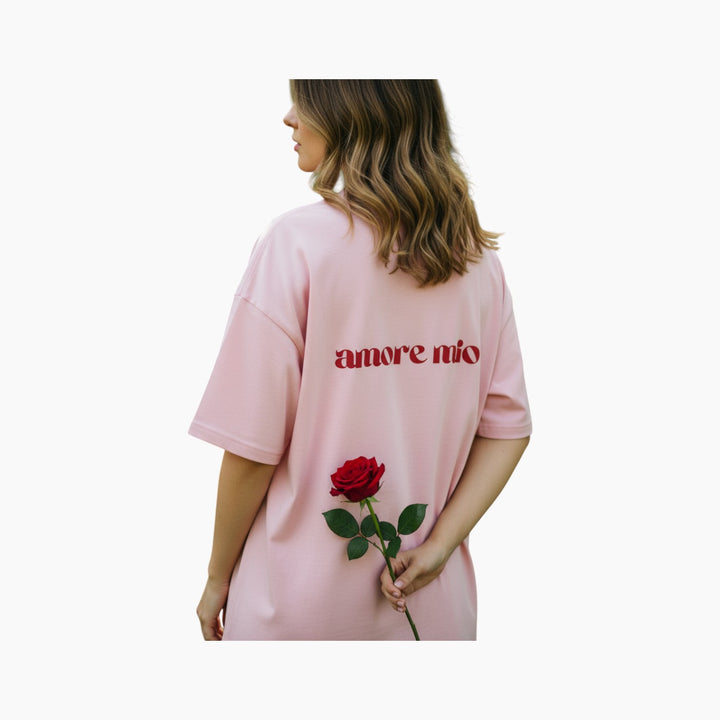Introducing the Amore Mio T-shirt, a statement piece designed to infuse your wardrobe with playful confidence and effortless cool. Crafted in a soft pastel pink hue, this tee offers a relaxed, unisex fit that embodies modern casual style.