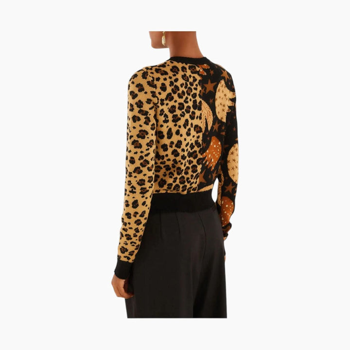 A striking knit that artfully blends playful motifs in an eye-catching jacquard design. With a mix of banana and leopard prints across a richly textured fabric,...