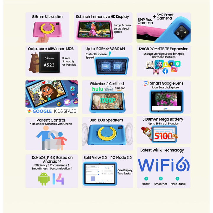 • Generous 128GB internal storage, expandable up to 1TB with a TF card, provides extensive space for downloading apps, storing photos, videos, and educational content.