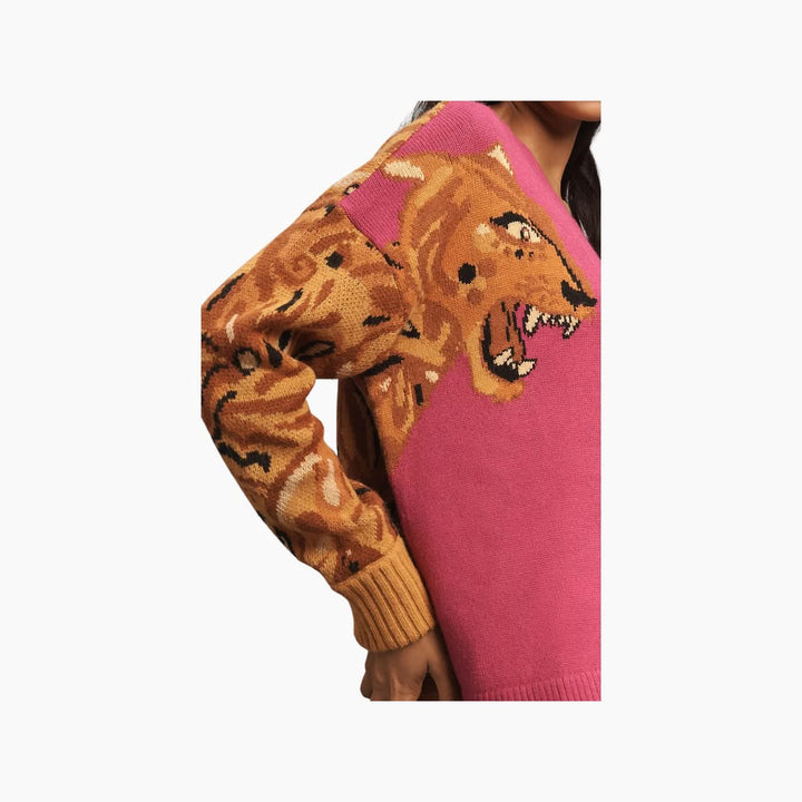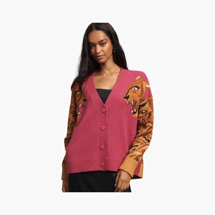 a bold and stylish knit piece that brings roaring personality to any outfit. With its vibrant fuchsia body and striking tiger motif across the sleeves and back, this cardigan becomes an instant statement of fun-meets-fashion.