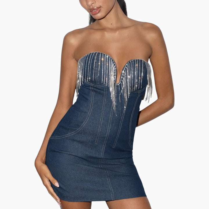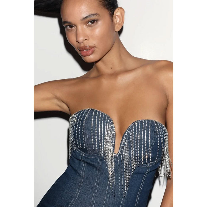 This statement piece seamlessly blends timeless denim with contemporary glamour, making it an ideal choice for upscale events or chic nights out.