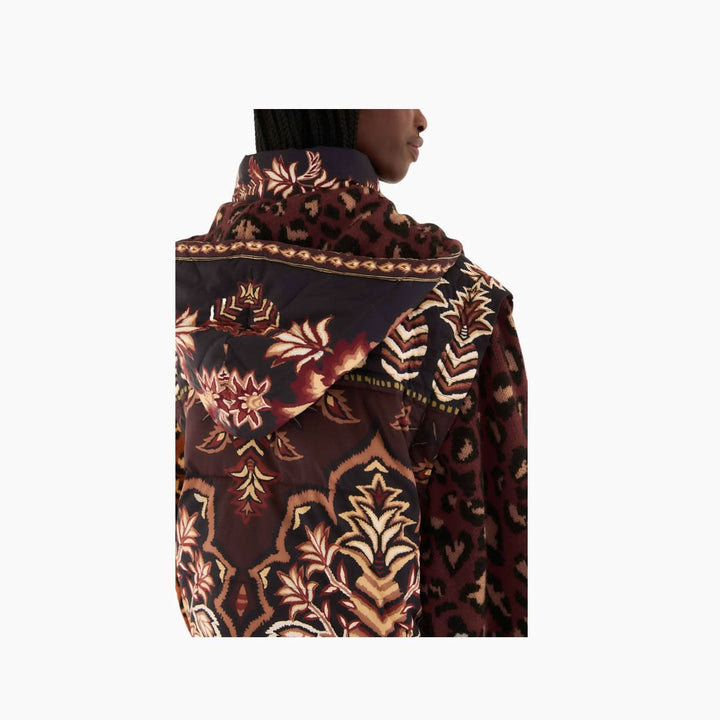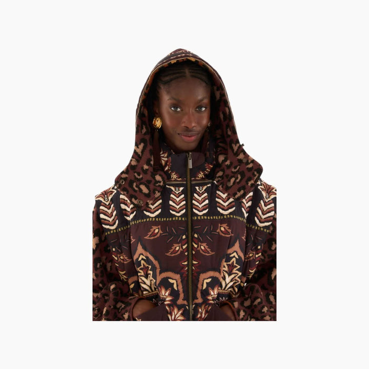 A joyful fusion of rich brown tones and playful print contrasts that elevates winter outerwear to a fashion statement. Featuring a high neckline, structured silhouette, and detachable hood, this jacket blends warmth with standout elegance.