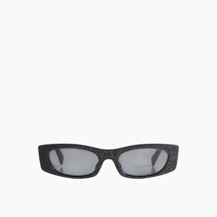 Designed for women who value both style and sophistication. Featuring a shiny black acetate frame accented with black crystal studs and grey lenses, these rectangular sunglasses combine elegance with modern flair. Perfect for everyday wear, they offer a chic accessory for any sunny occasion.
