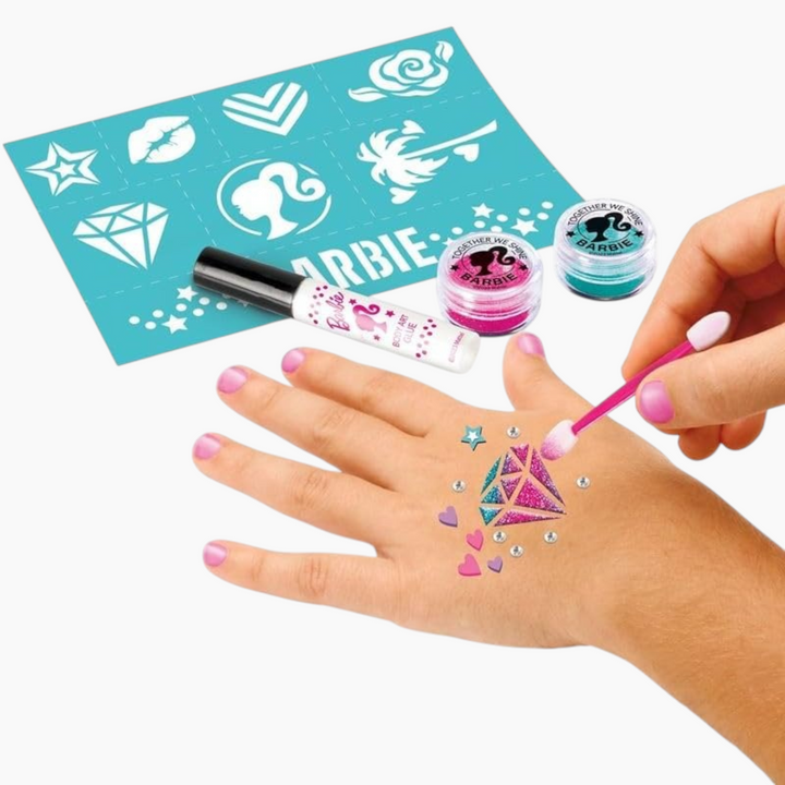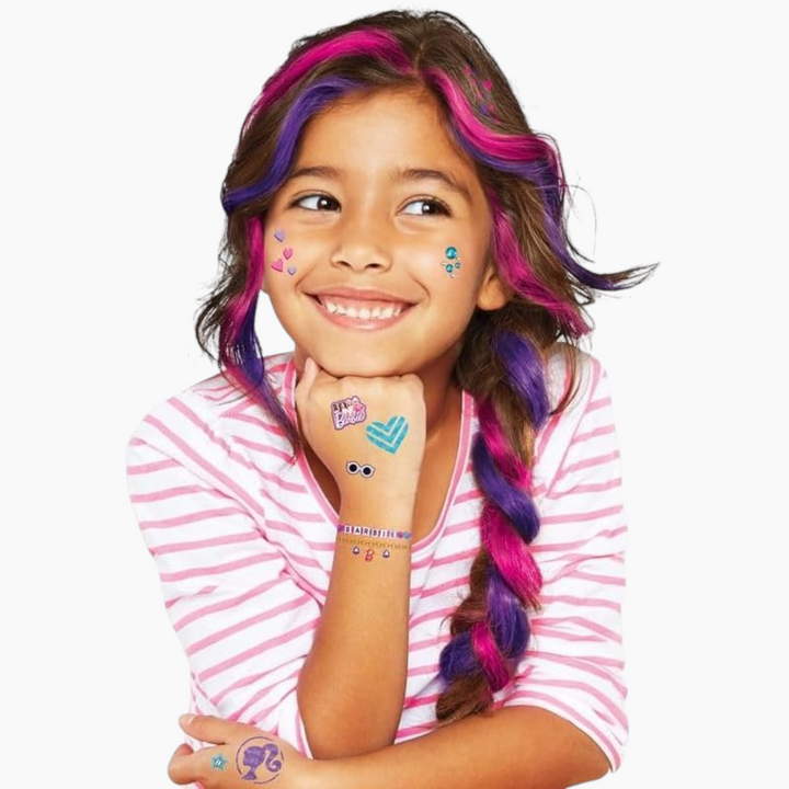 - Recommended Age: 8 years and older - Includes: 2 hair chalk pens, 2 pots of glitter (1 g each), body glue (4 ml), 4 sheets of tattoos, 1 sheet of nail decals, 1 stencil sheet, 2 applicators, 1 brush, 1 bag of gems, and instructions - Dimensions: 20 × 22 × 3 cm - Weight: 0.285 kg - Material: Non-toxic plastic and cosmetic-grade ingredients - Batteries Required: None - Safety: Designed for safe and easy use by children
