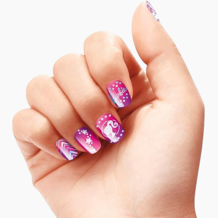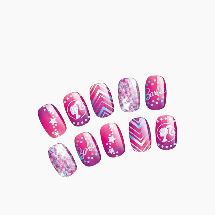 - Allows creation of shimmering nail art with Barbie-themed decals and sparkling gems.