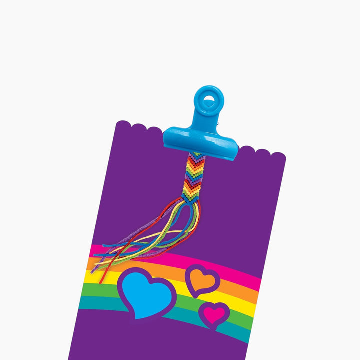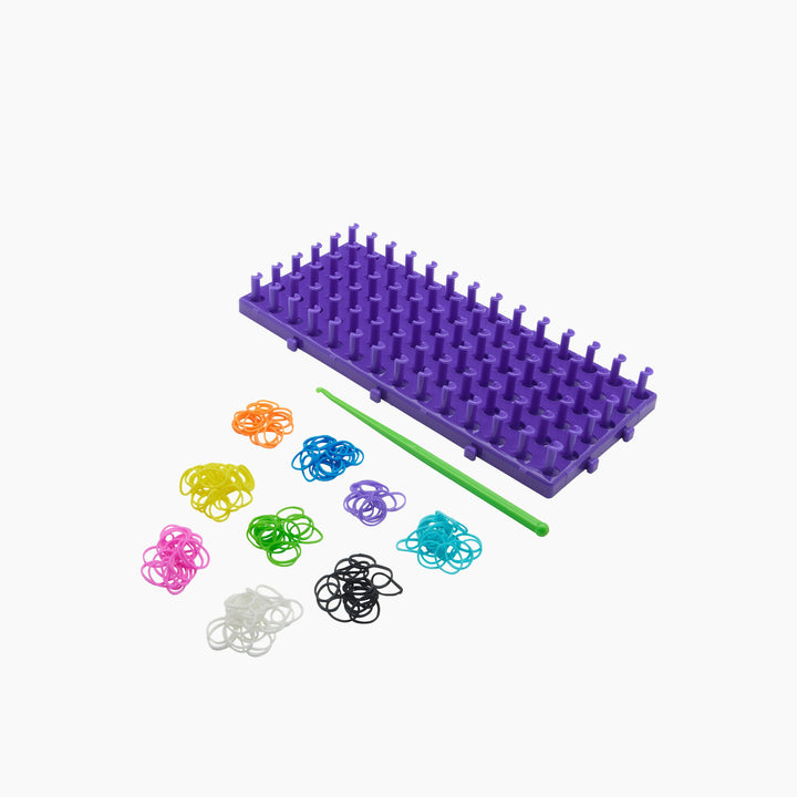 - Includes: 1 super loom, 1 hook, 1600 latex-free rubber bands, 1 sheet of puffy charm stickers, 40 “C” clips, 1 lanyard clip, 25 jump rings, 1 friendship bracelet board with clip, 10 skeins of floss, 5 beads, 1 elastic cord, and instructions