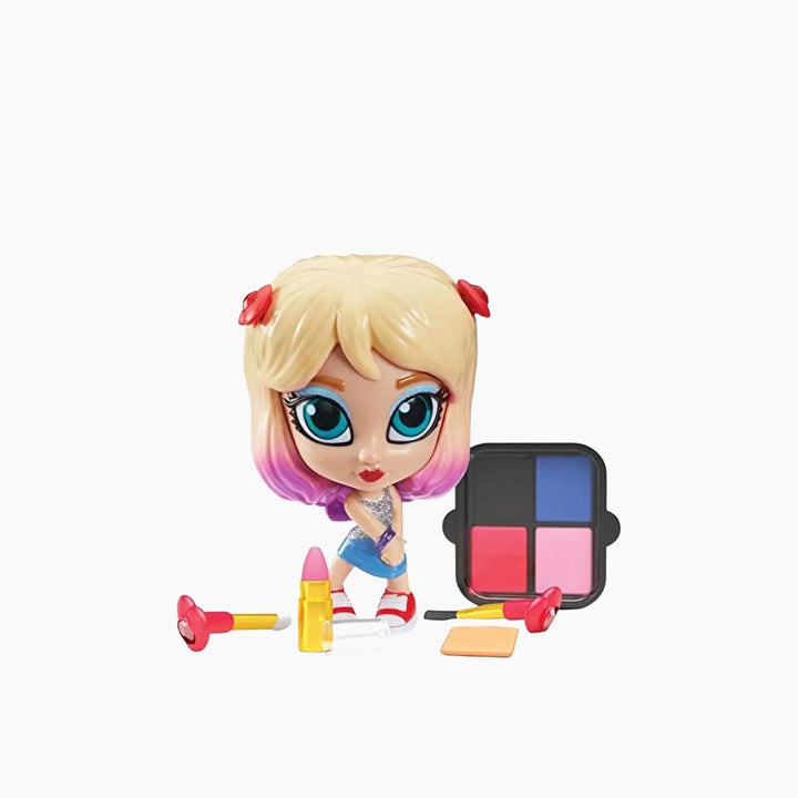 - Includes: Poseable doll with removable brush and sponge applicators, hidden makeup compartment with real makeup (1 mini lipstick, 2 eye shadows, 2 lip glosses), and a gold display stand