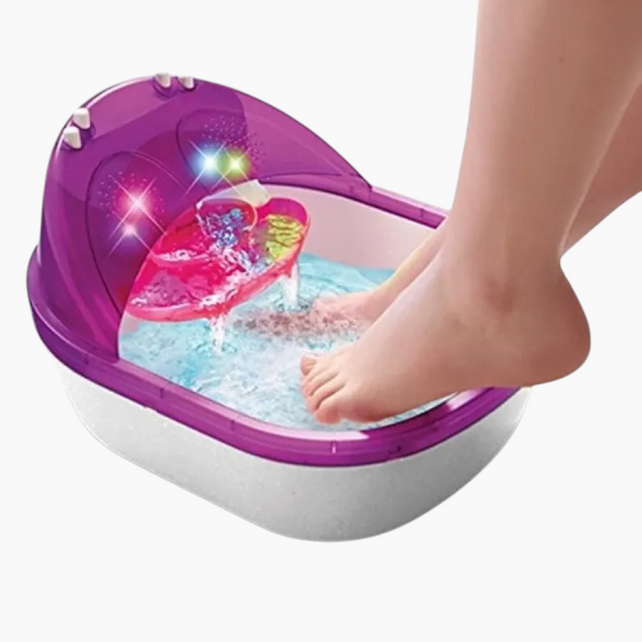 - Features: massaging foot rollers, skin-smoothing buffer, cascading waterfall, bubbling water, colour-changing lights