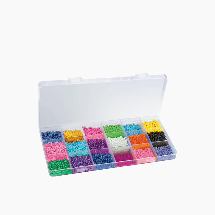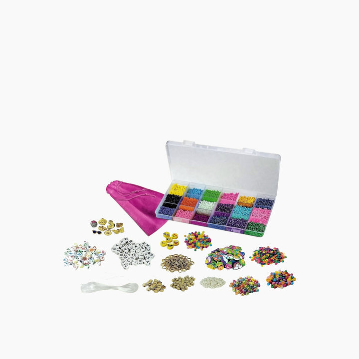 - Includes: 3,600 seed beads, 600 disc beads, 200 assorted round beads, 144 alphabet beads, 75 small pony beads, 75 assorted metal beads, 50 pearl beads, 80 clay charms, 8 metal charms, 6 emoji beads, 90 jump rings, 1 skein of elastic cord (12 yards), bead case, storage bag, threader tool, and instructions
