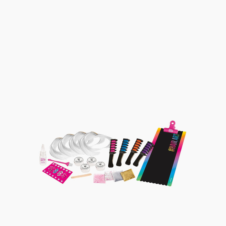- Includes: 4 reusable clip-in hair extensions, 4 hair chalk combs (fuchsia, orange, blue, purple), 1 glitter gel, 4 glitter packets, 2 sequin packets, 1 design board, 1 hair clip, 4 clear containers with lids, 1 application brush, 1 mixing stick, and 1 sheet of stick-on hair gems