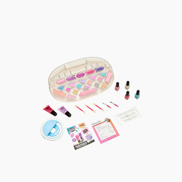 - Includes: 12 eye shadows, 5 lip colors, 3 cheek colors, 2 contour colors, 2 lip gloss tubes, 4 nail varnish colors, 3 makeup applicators, 2 mini brushes, clip-on selfie light with 3 brightness levels, USB charging port, phone holder, and Media-mazing Makeup Guide