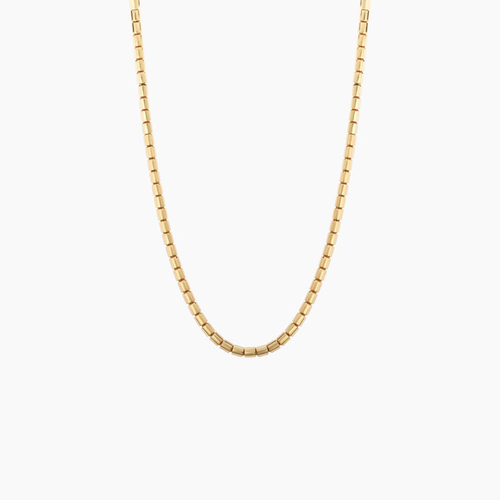 Elevate your everyday style with the exquisite Cylinder Chain Necklace. This beautifully crafted piece offers a timeless elegance, designed to effortlessly enhance any ensemble.