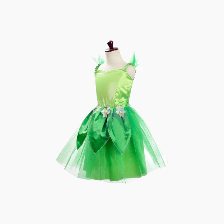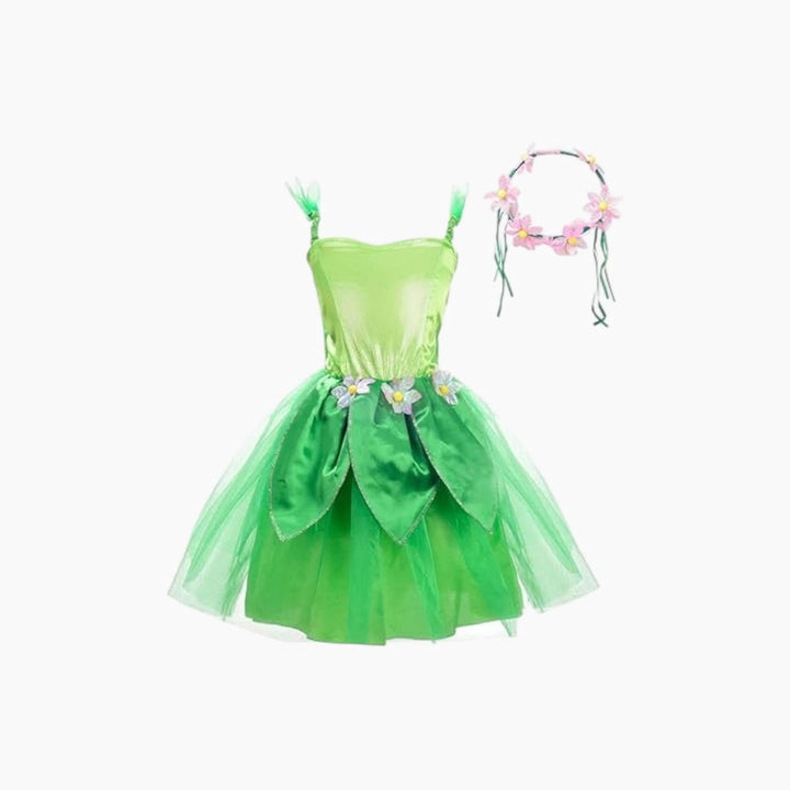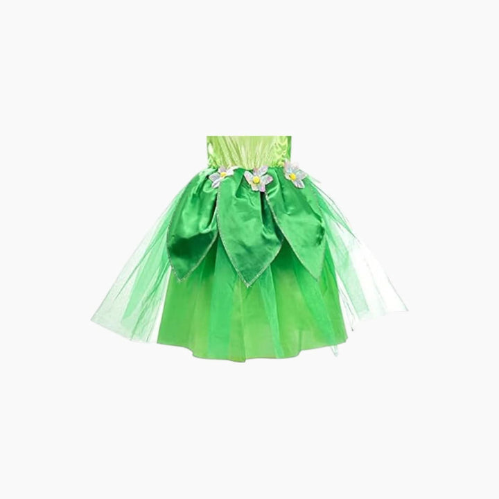 - Skirt Design: Green satin base topped with leaf-shaped overlay and flower accents for a fairy-like look