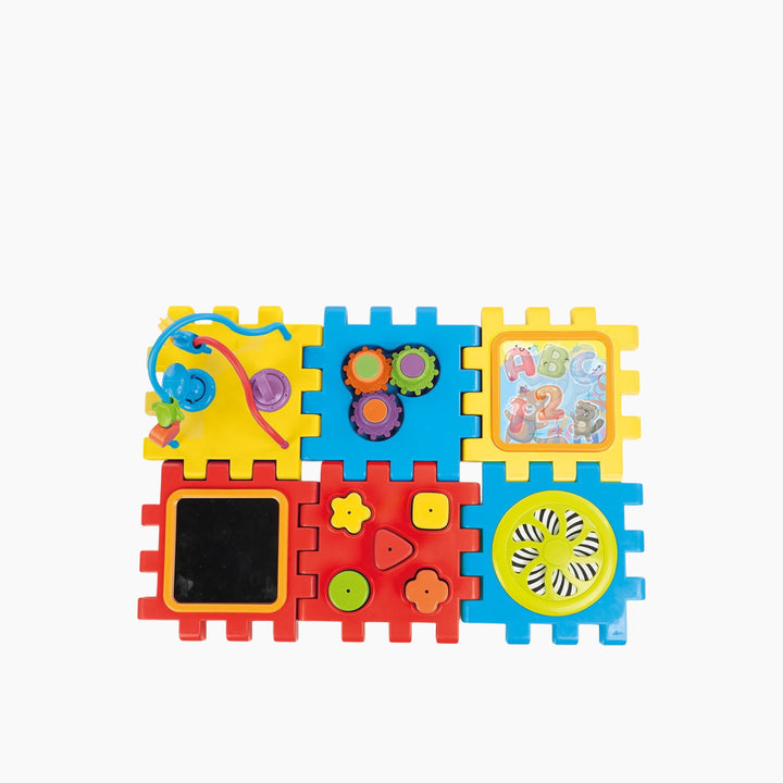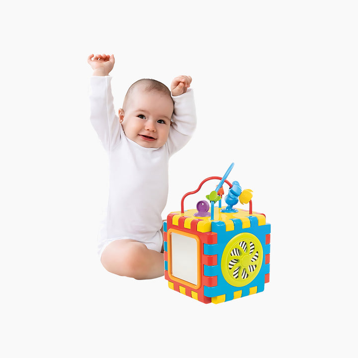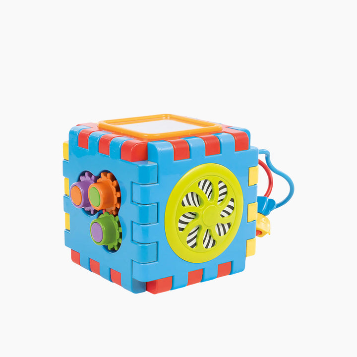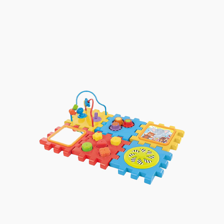 - Features: Mirror, shape sorter, spinning gears, bead maze, and more