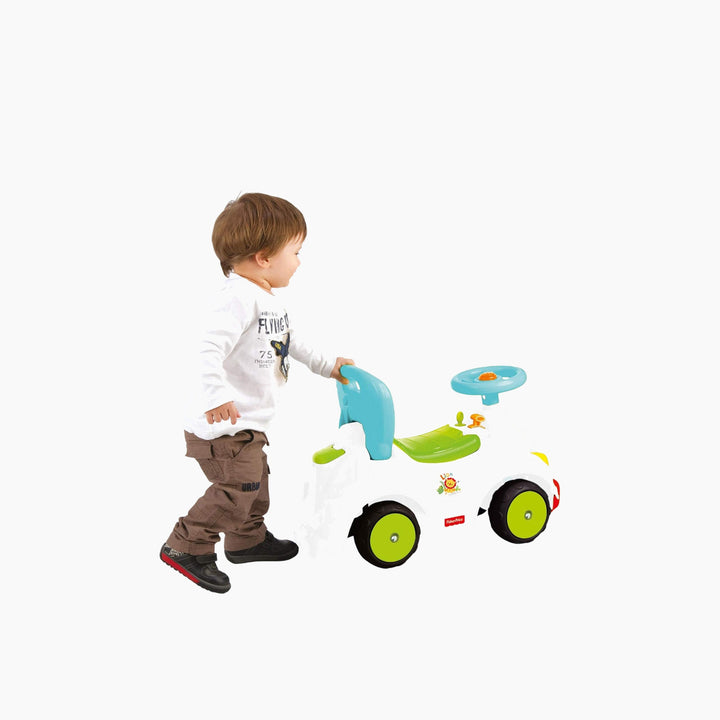 - Features: Built-in storage under the seat, squeaky horn on the steering wheel, adult push handle