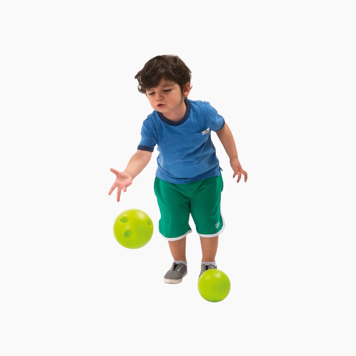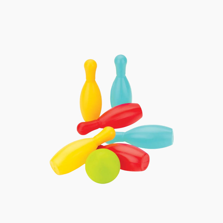 - Brightly colored pins and ball attract children's attention and encourage active play.