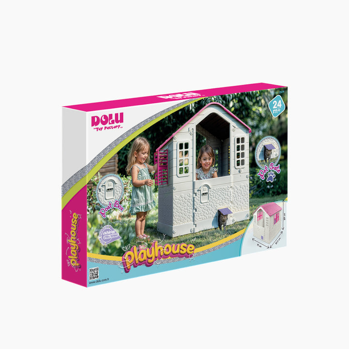 Let young imaginations soar, designed for children aged 2 and up. This charming playhouse features a crisp white exterior complemented by vibrant pink windows, a pink roof, and a bold blue door. Whether placed in a garden or an indoor playroom, it provides a delightful space for creative role-play and social interaction.