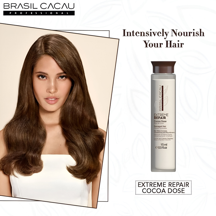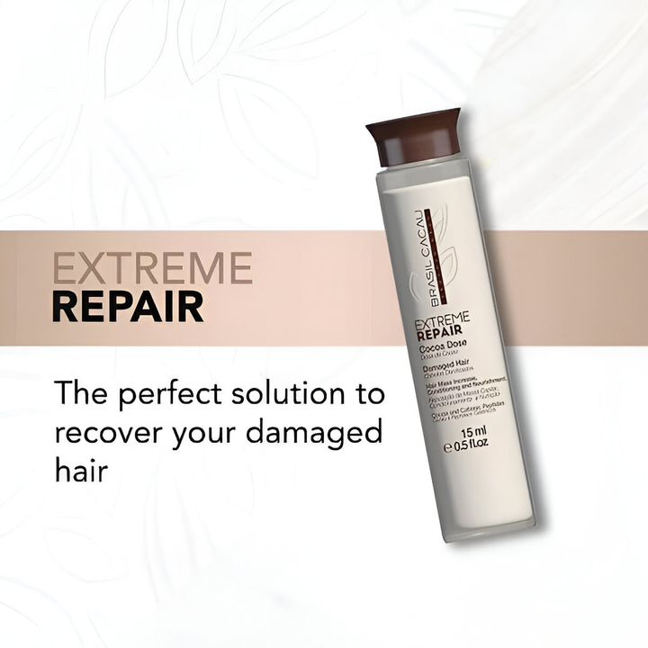 The Brasil Cacau Extreme Repair Cocoa Dose is an intensive hair repair treatment formulated to restore vitality, strength, and elasticity to severely damaged hair. Enriched with nourishing cocoa butter and restorative peptides, this concentrated treatment penetrates deeply into the hair fibers, rebuilding structure and leaving hair soft, shiny, and resilient. Ideal for hair weakened by chemical or thermal processes, it delivers salon-quality repair in minutes.
