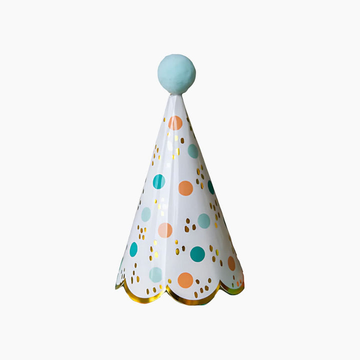 - 8 playful party hats with cheerful pompoms and gold foil details
