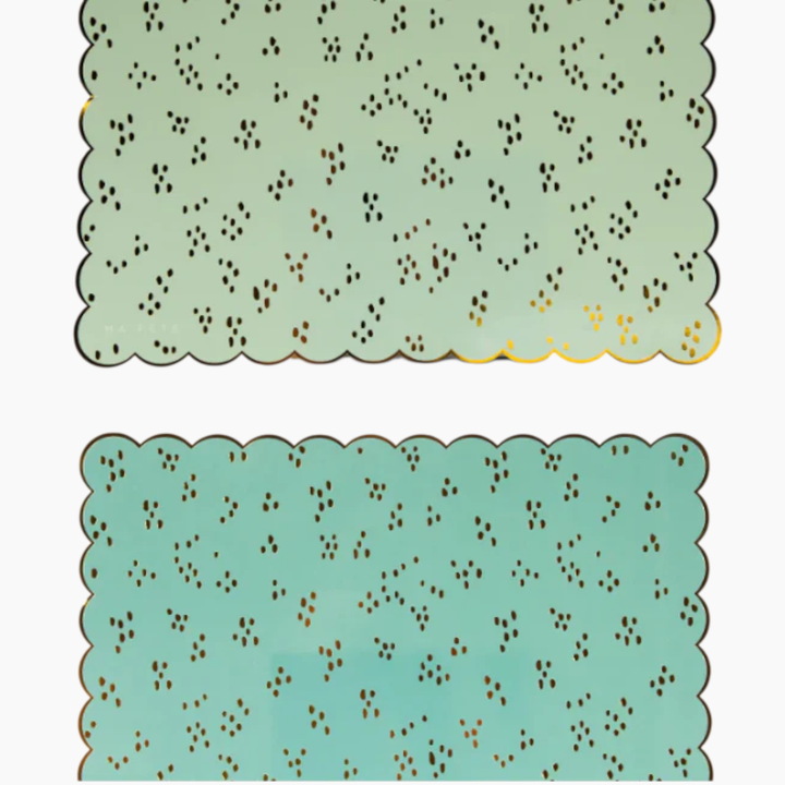 - High-quality placemats with scalloped edges and delicate gold foil accents offer a sophisticated finish.