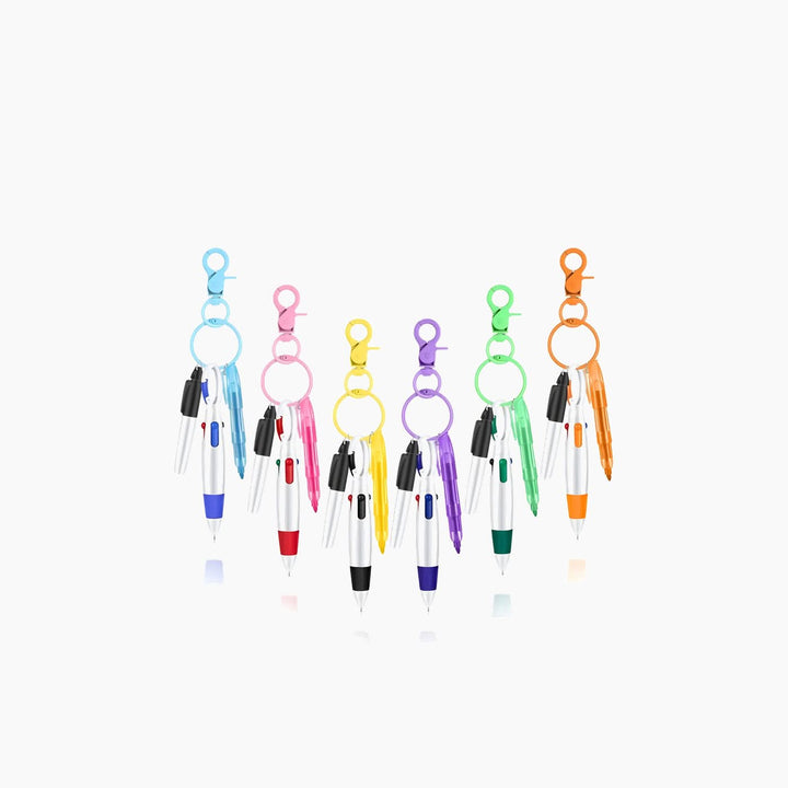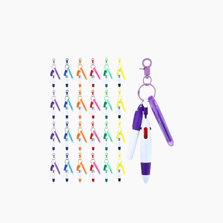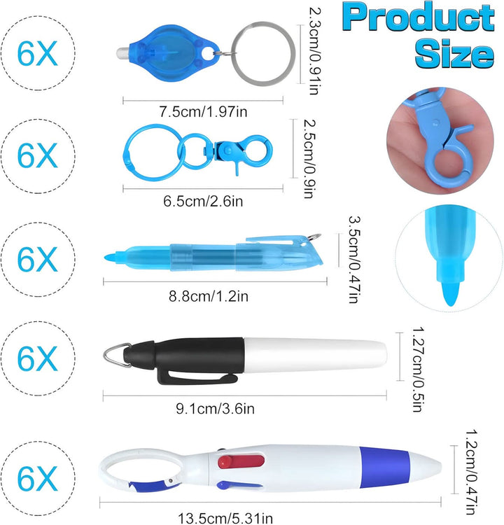 - Set Includes: 72 pieces comprising retractable pens, mini highlighters, permanent markers, LED flashlight keychains, mini scissors, and badge reels