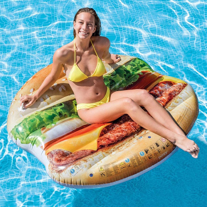 Turn poolside relaxation into a fabulously fun experience. With its whimsical 3D burger design and generous dimensions, this inflatable float blends playful style with comfortable lounging for a standout addition to any summer day. Perfect for those who love lounging with flair, it adds both charm and function to your water adventures.