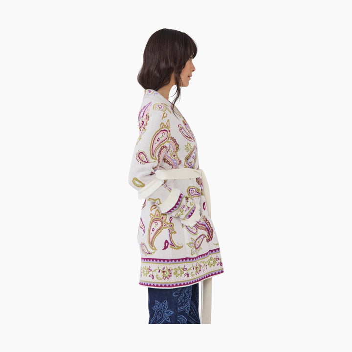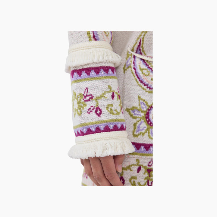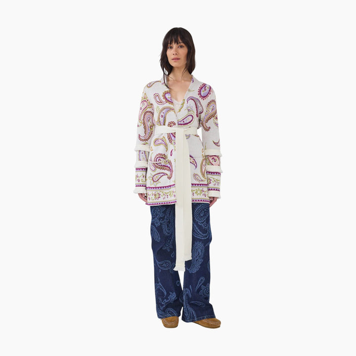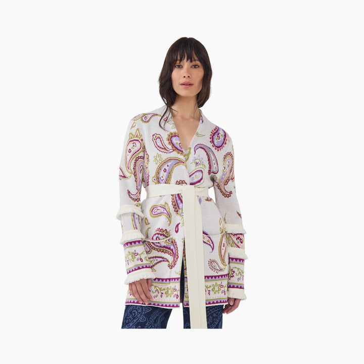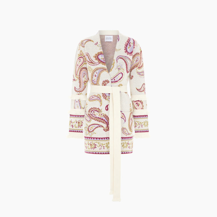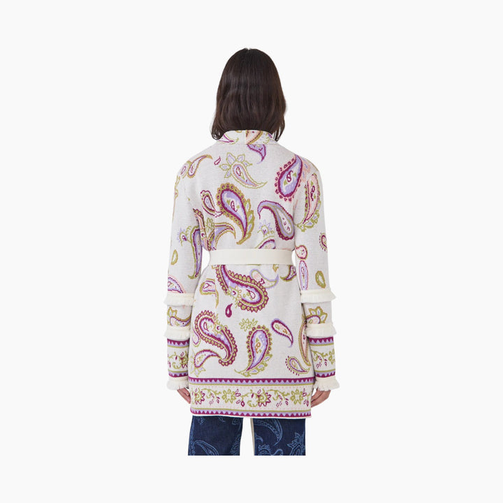 A refined bohemian layering piece that merges intricate design and wearable versatility. Woven in a creamy cotton jacquard paisley, this cardigan features tiered fringe sleeves, a geometric border, and a matching knitted belt to cinch the mid-length silhouette in effortless elegance.