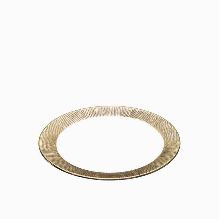 The IVV Jedah Plate is crafted from high-quality transparent glass, ensuring clarity and a refined look. Its simple yet original design features a gold-colored band that decorates the outer perimeter edge, adding an elegant touch to the piece. This plate is not only a beautiful decorative item but also serves as a versatile centerpiece bowl, perfect for various uses such as displaying fruits, decorative items, or floral arrangements.